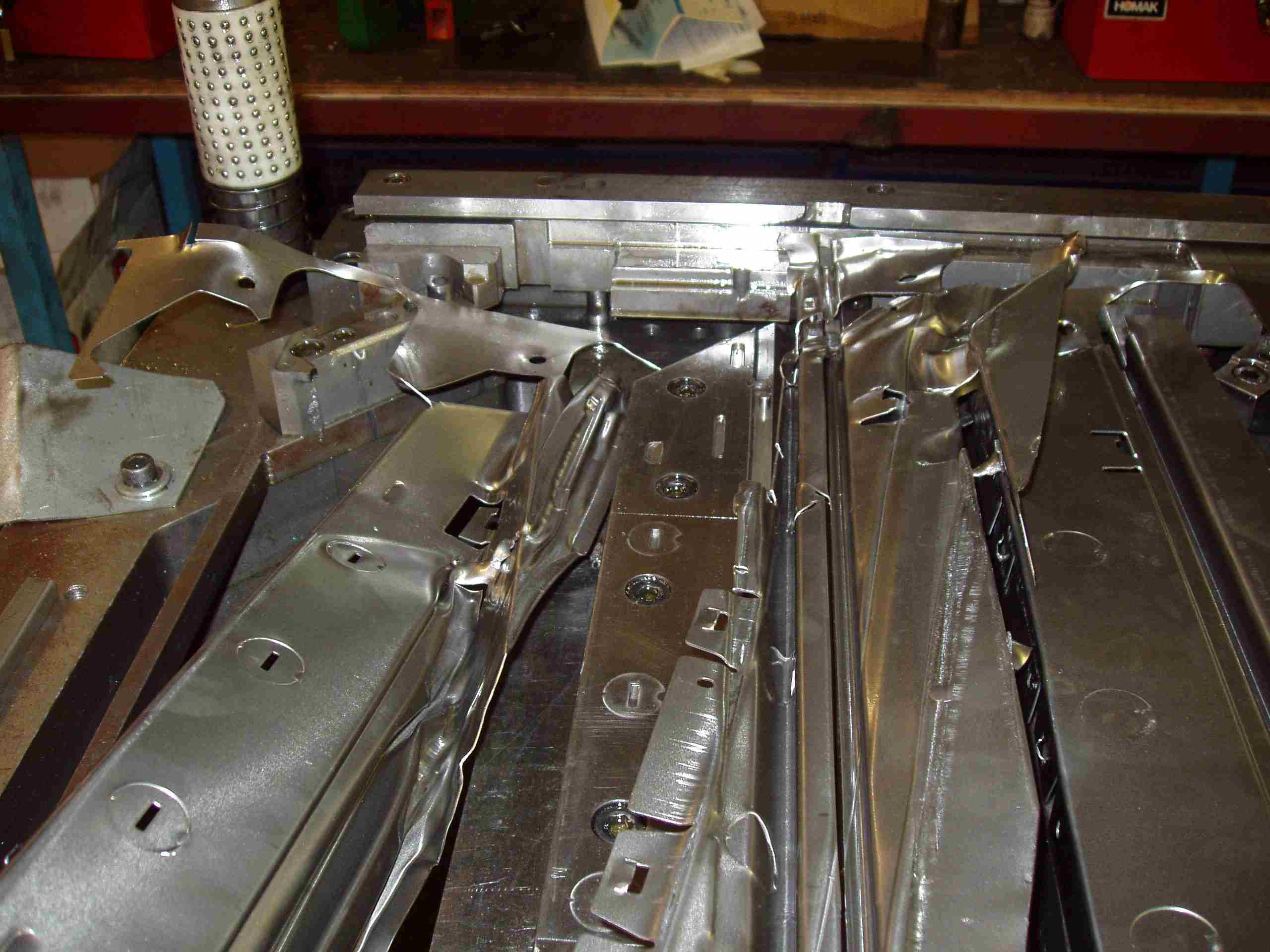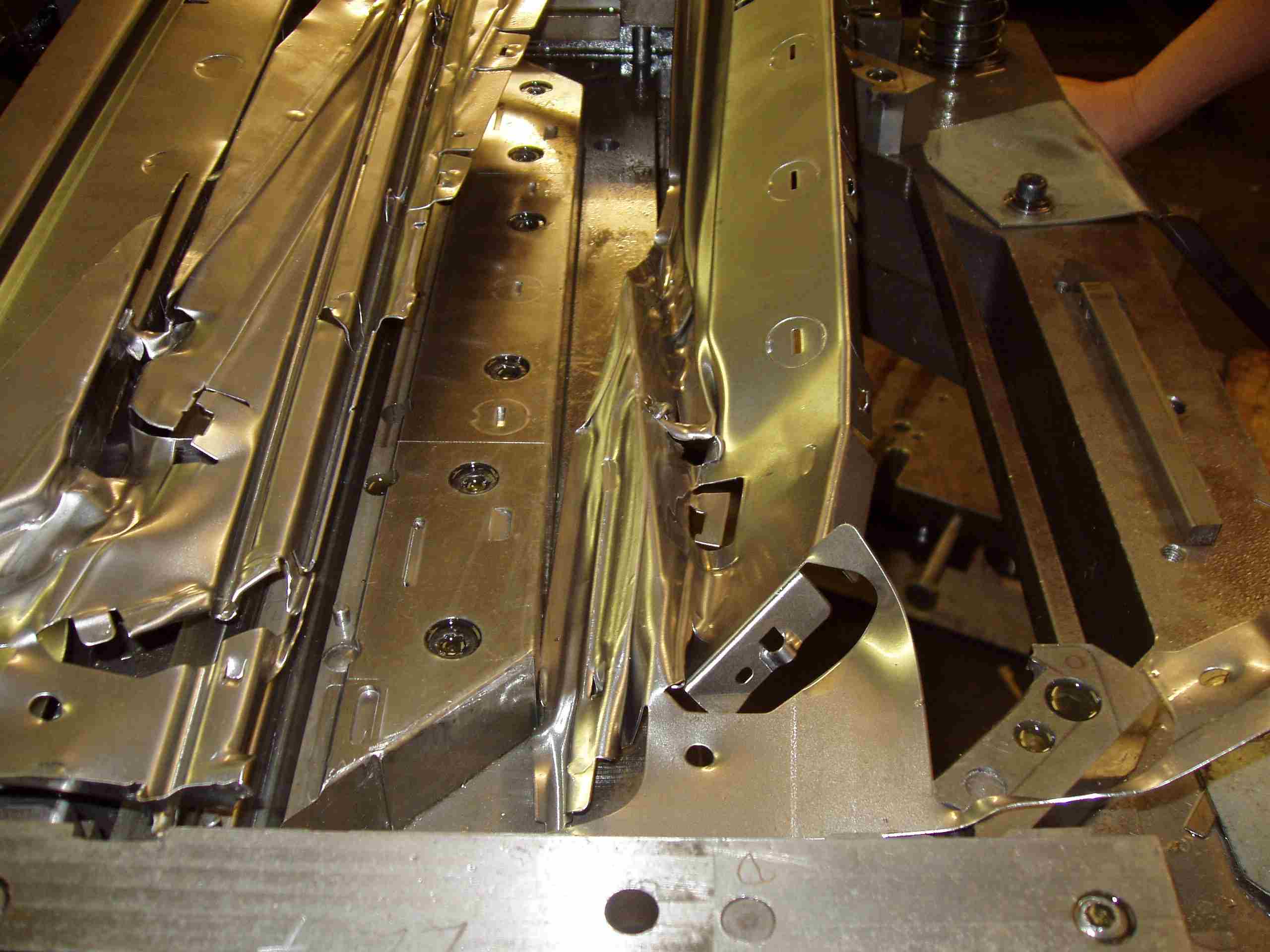 A tool for a particular part would periodically fail to eject the formed part and would feed more sheet steel in the tool. This would result in the next press cycle pressing the new sheet on the un-ejected part, causing breakage of the tool (seen right).