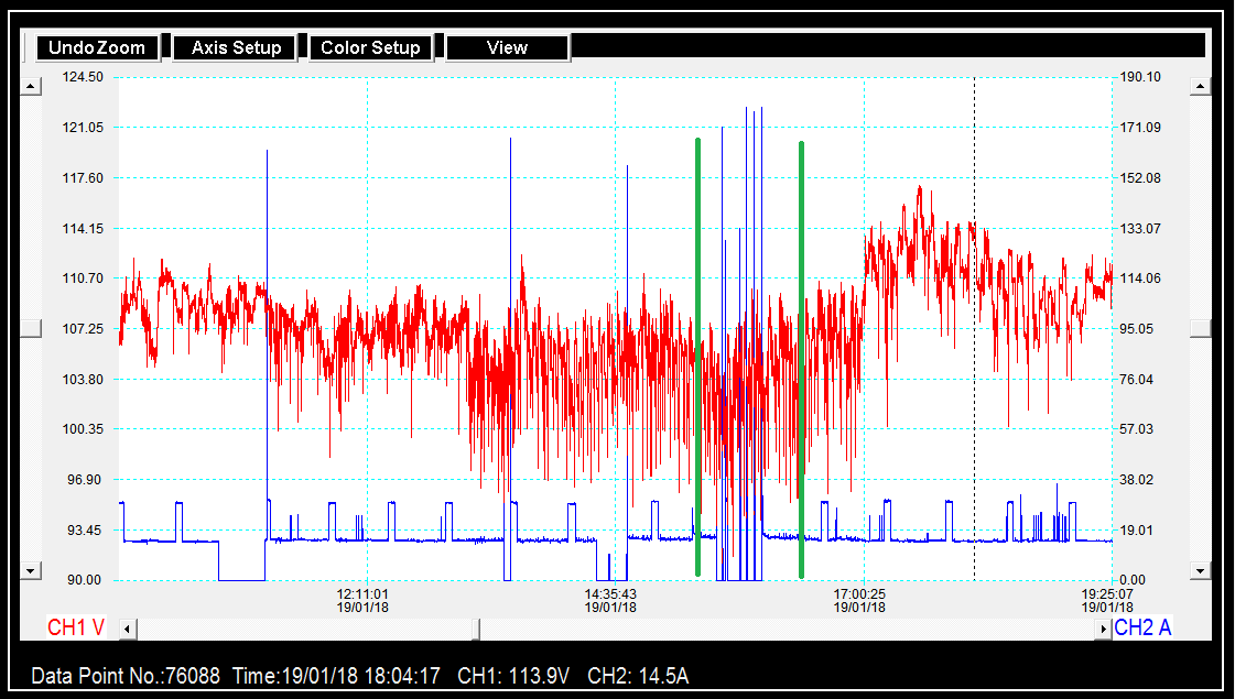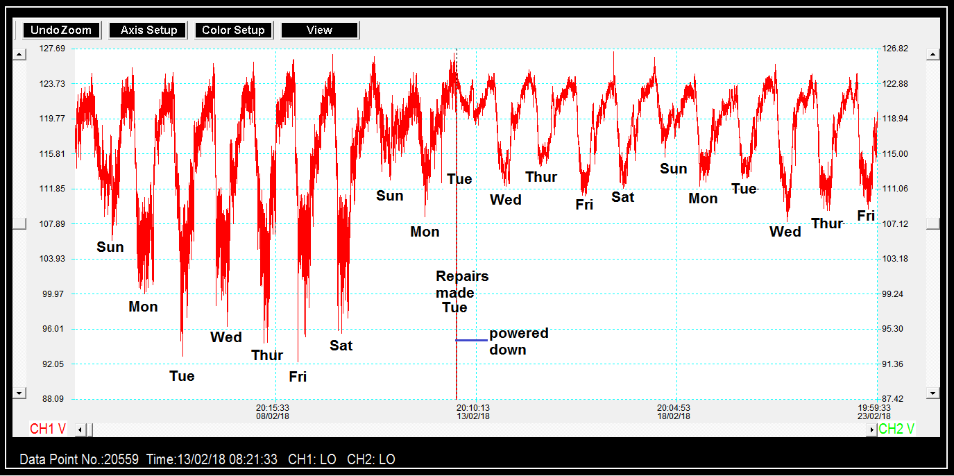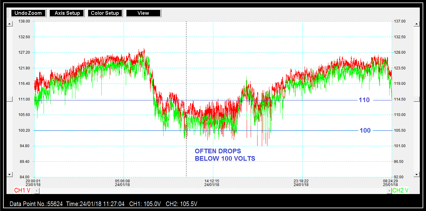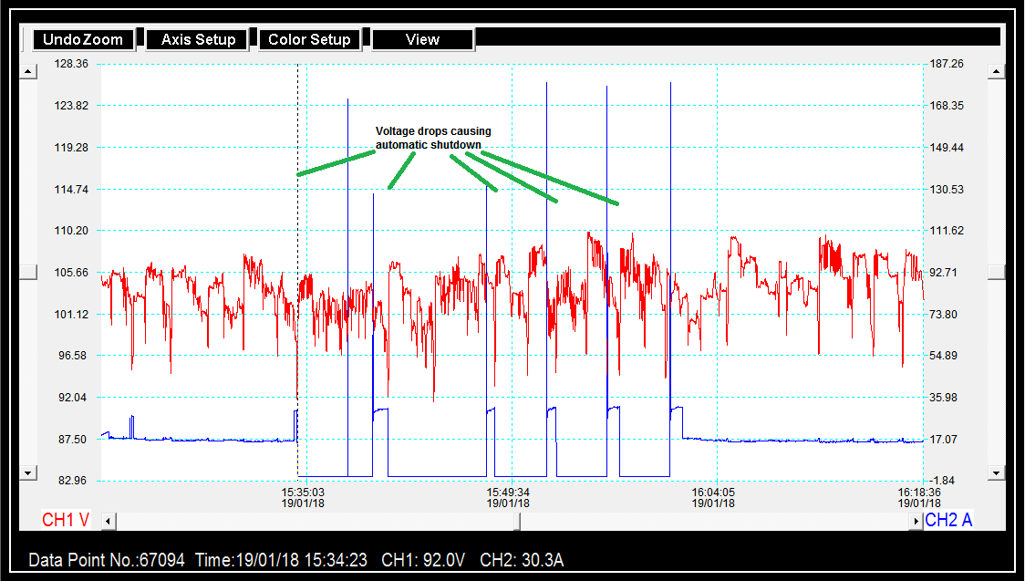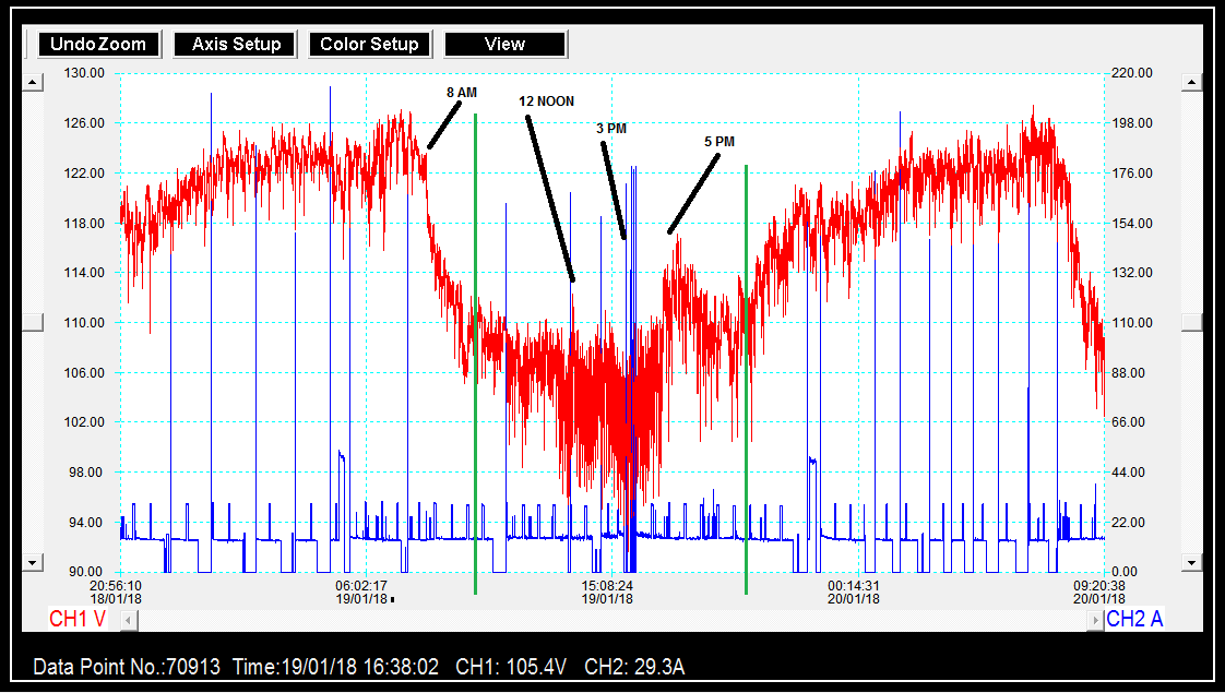 A graph of current and voltage from the logged data plotted indicates a voltage slump during normal work hours