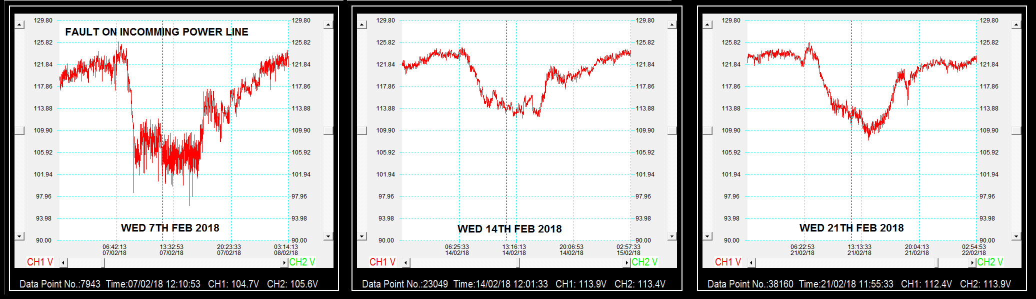The power lines were logged again over a working day and the two phases were monitored and logged for voltage difference between phases.